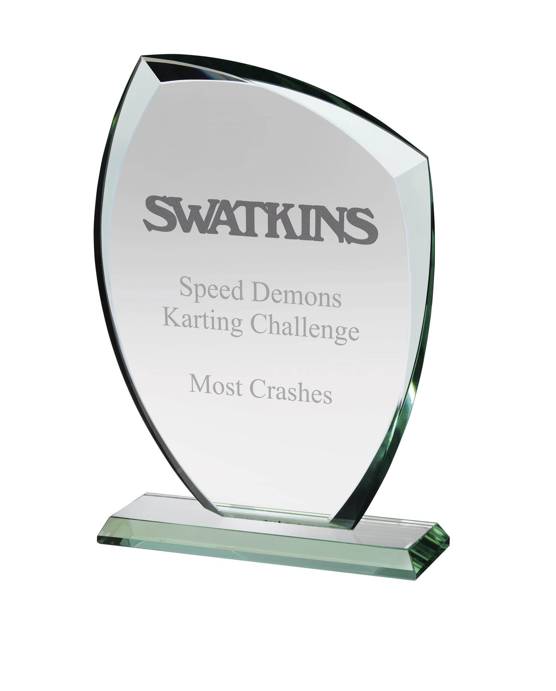 With its simple slanted oval shape, this award has universal appeal. It is cut from premium 12mm thick jade glass and features an engraving area, where you can customise the award with your choice of text or logo. It is set on a 15mm thick rectangular glass base, allowing for easy display.This product is available in three sizes and is supplied in a black Swatkins presentation box.