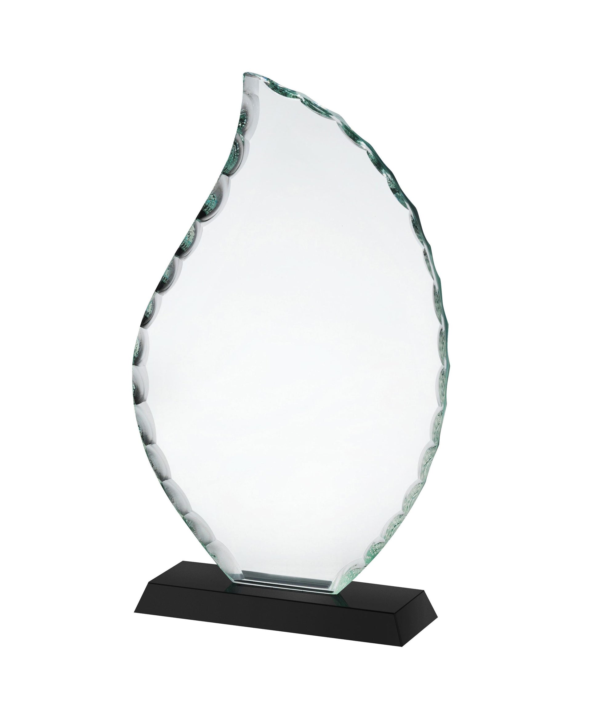 Cut from clear crystal glass, this teardrop shaped award features a pointed peak, smoothly curved sides and an attractively patterened edge. It includes an area which can be customised with your own personal engraved message and is mounted on top of a thick black glass rectangular base.This product is available in three sizes and is supplied in a blue Swatkins crystalware presentation box.
