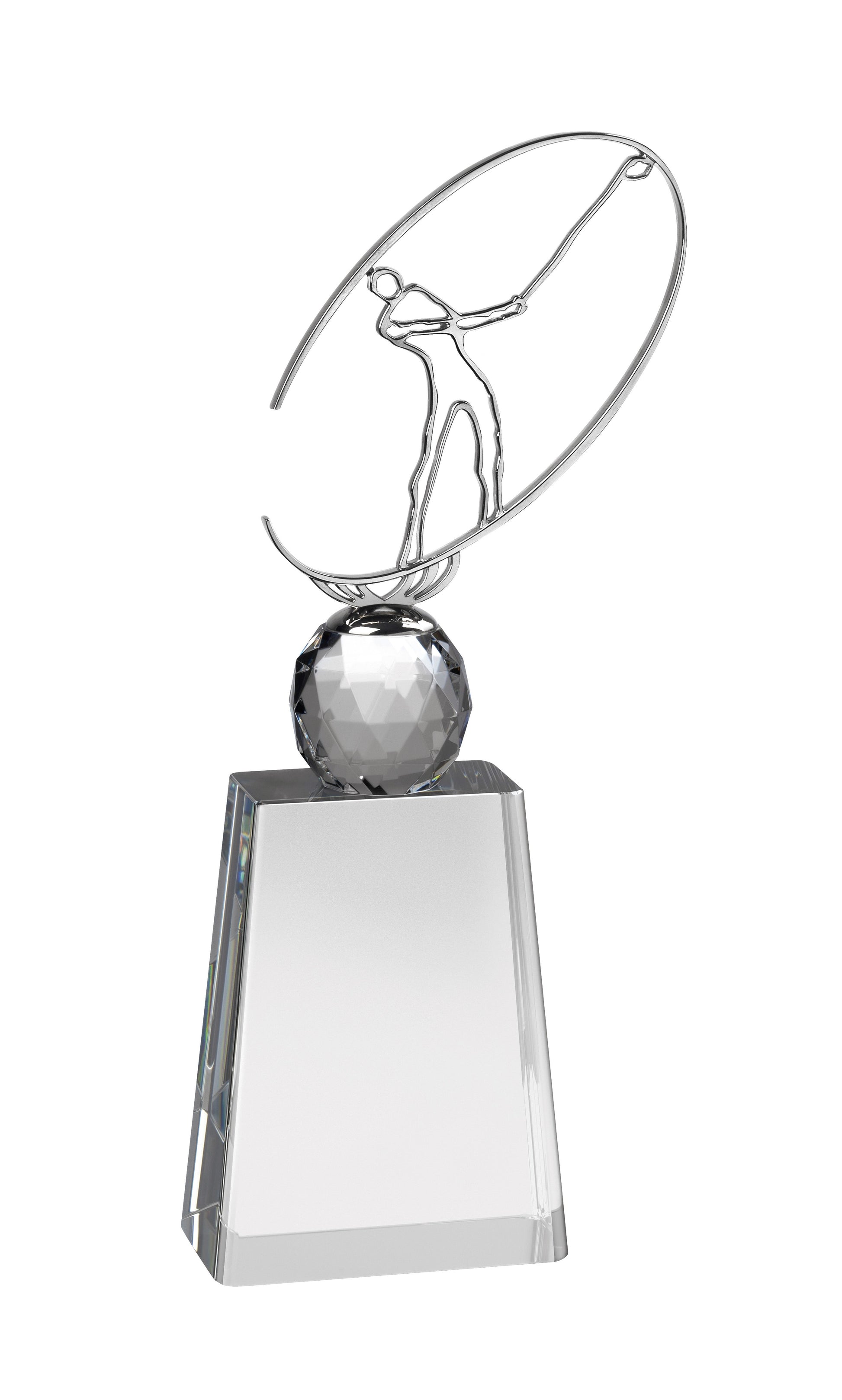 This Modern Optical crystal golf award comes with an elegant metal swinging golfer mounted on top of a crystal shaped golf ball. The ample engraving area makes this award perfect for engraving your company logo/crest and personalised message. Award comes with presentation case.