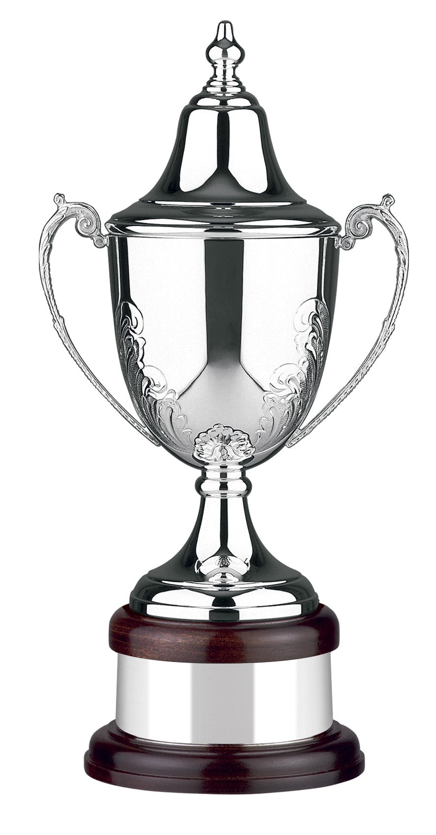 The COTSWOLD cup hand chased and made in Britain traditionally using the finest materials. An impressive floral design on the body leaves plenty of area for any inscription. Supplied complete with lid and silver plated plinth band.