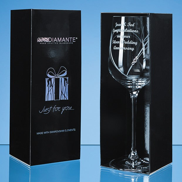 Slender, sophisticated, understated. This elegant, contemporary ‘Just for you’ wine glass is hand cut with a stylised heart shaped design and sprinkled with three sparkling Swarovski ‘Diamante’ crystals. There is a generous space to engrave a logo, crest, dedication or inscription, making it ideal as a personal or corporate gift or memento. Plus it is packaged in a beautiful designer presentation box.