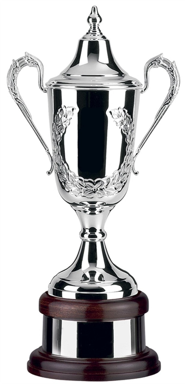 The FORMULA SUPREME range is available in a plain or hand chased version. (please see L490 series for the hand chased version) The hand chased version is an elegant silver plated cup, complete with hand chased patterned handles, mahogany base and plinth band. The body of the cup is hand chased with a stunning laurel wreath design and is perfect for engraving your text. Available in three sizes.