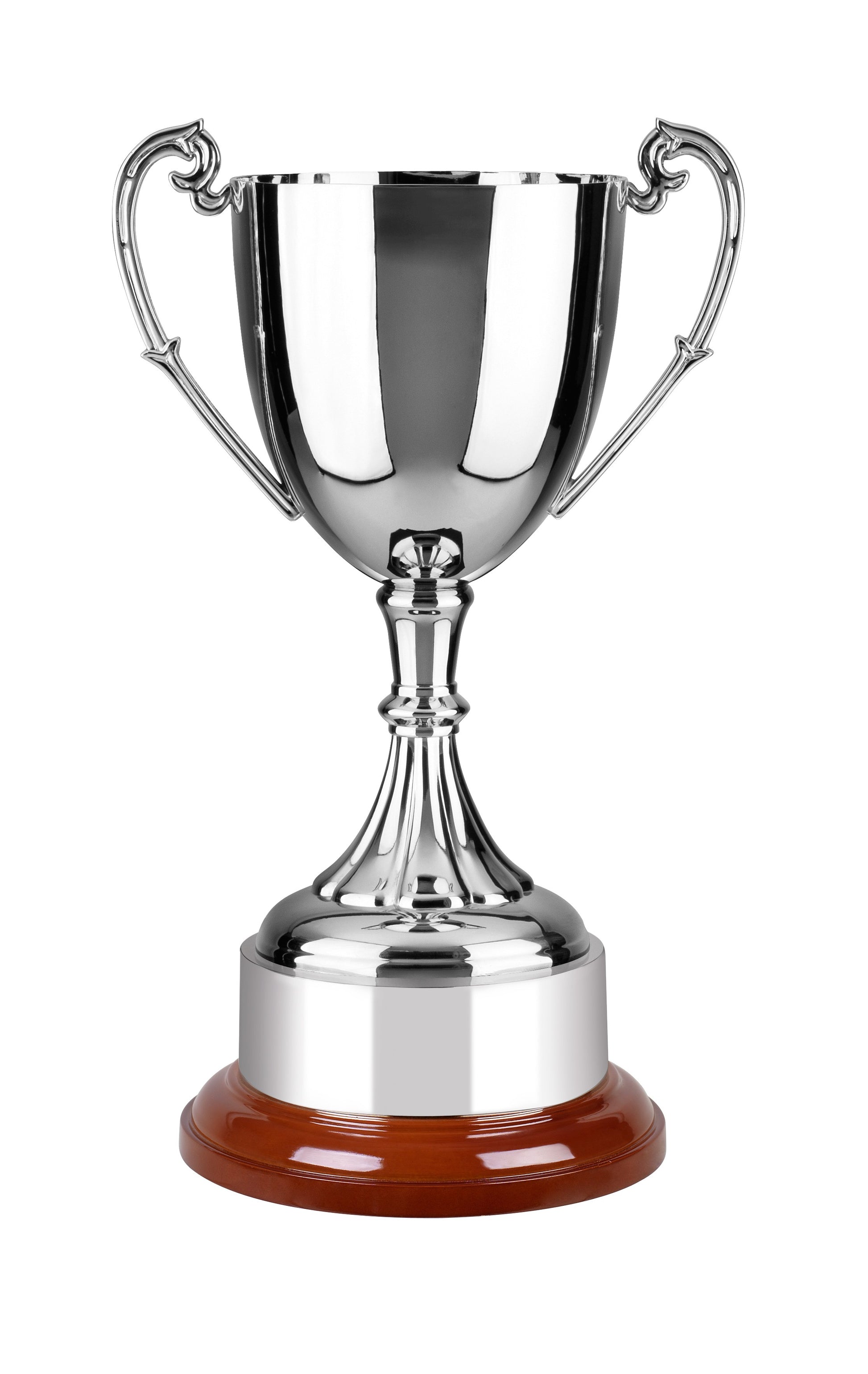 This handsome endurance cup has been nickel plated and mounted on a highly polished wooden base. The new design for 2011 features an ornate handle on each side of the cup and a fluted pattern around the foot. This stunning cup is available in 6 sizes and can be engraved on the body of the cup with your companies logo and text. An optional plinth band can be purchased to be used for annual insertions making this a perfect award for an annual competition or memorial.