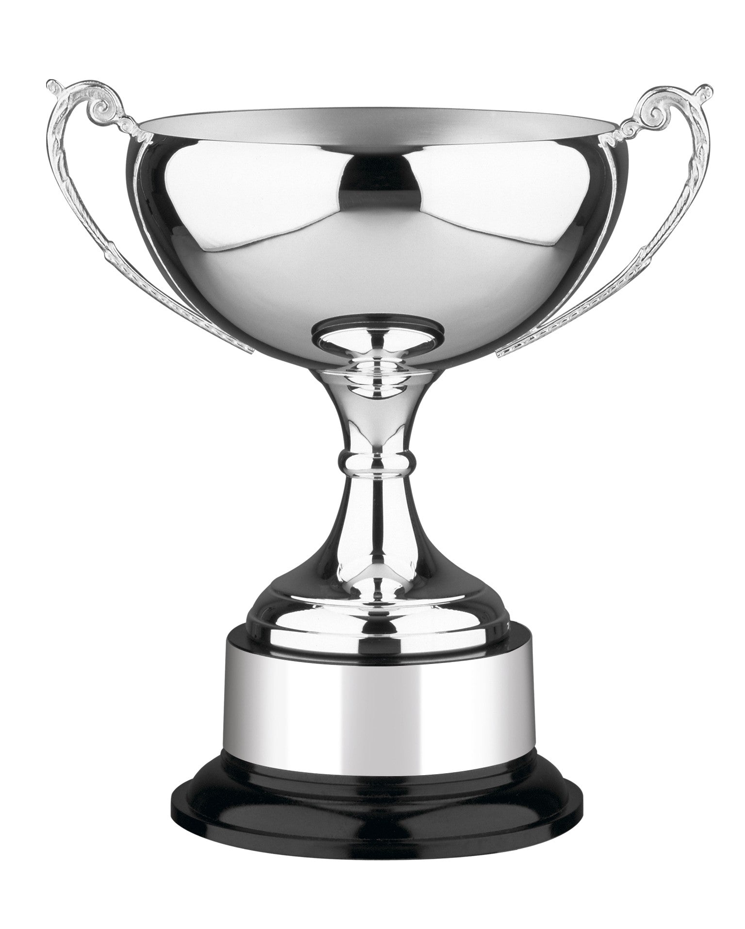 Olde English, traditional wide silver plated cup. Simple yet flawless with decorative handles. Can be supplied with optional plinth band can be engraved on the body with any text.
