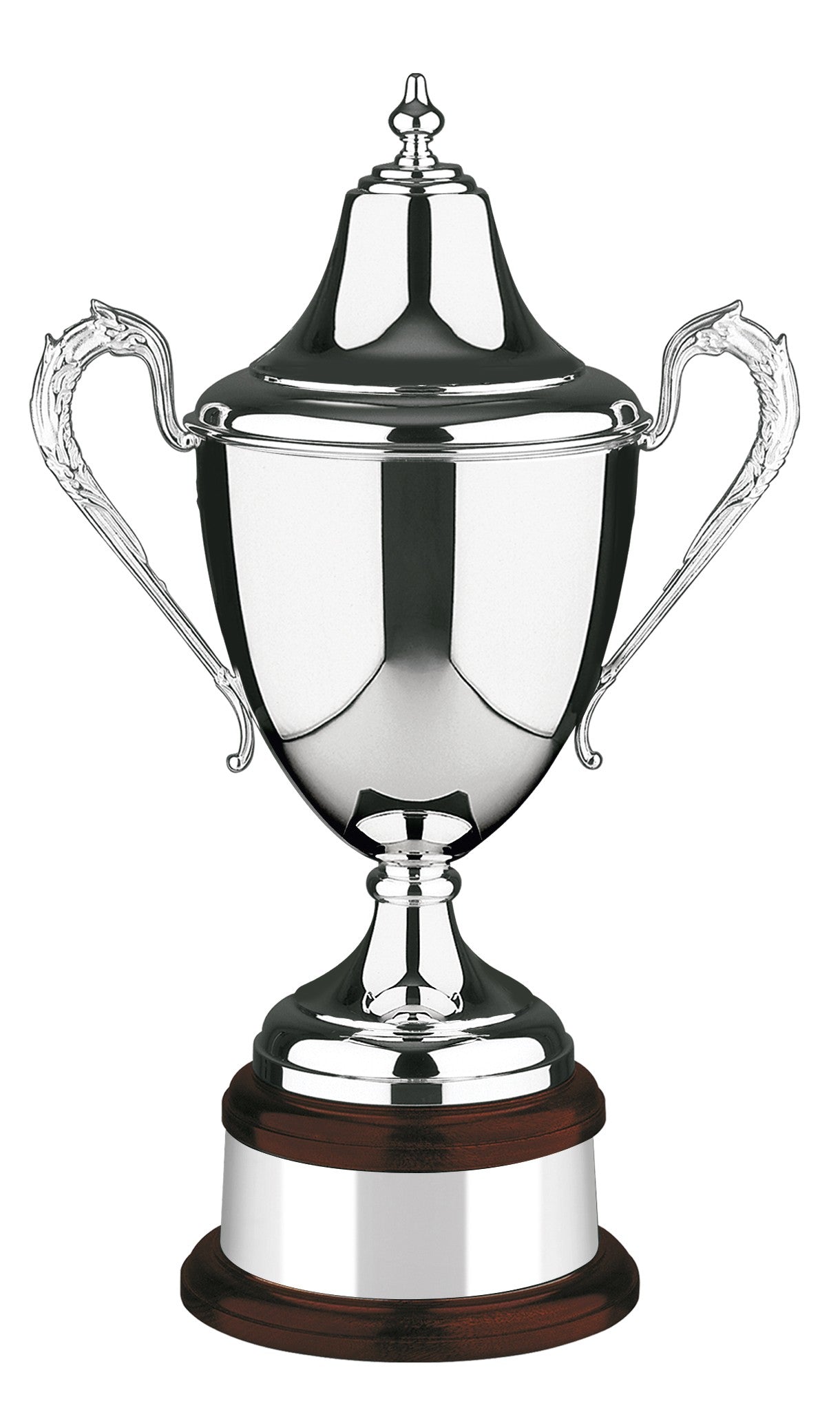 The RIVIERA cup is available in a plain or hand chased version. (please see L100 series for the hand chased version) The plain version is an elegant silver plated cup, complete with hand chased patterned handles, mahogany base and plinth band. The body and of the cup is perfect for engraving your text. Available in three sizes.