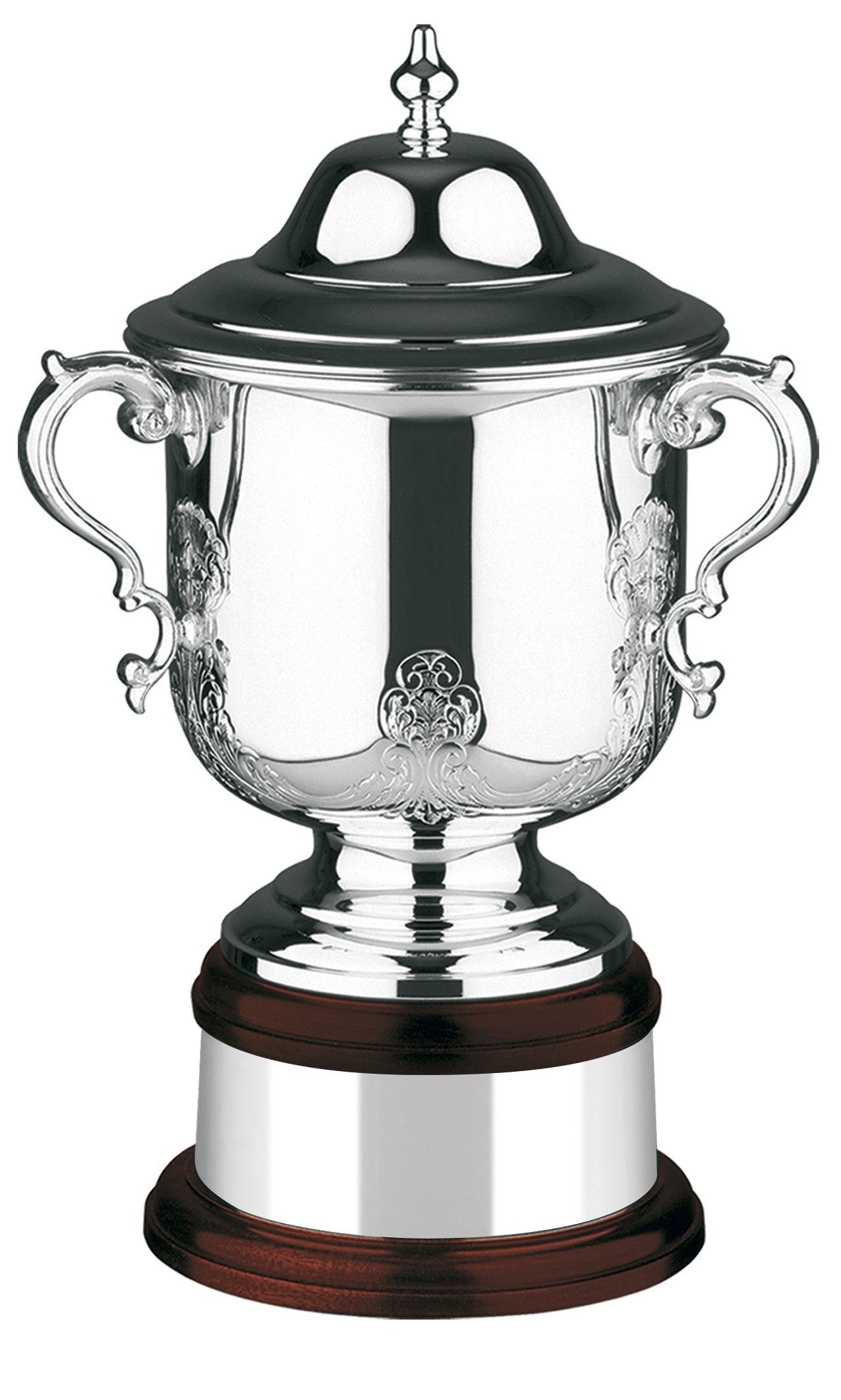 The LEAGUE CHAMPIONS range is available in a plain or hand chased version. (please see L101 series for the plain version) The hand chased version has an elegant floral design on the sides and foot of the body of the cup. Complete with a mahogany wood base and plinth band there is ample room for engraving your text. Available in three sizes.