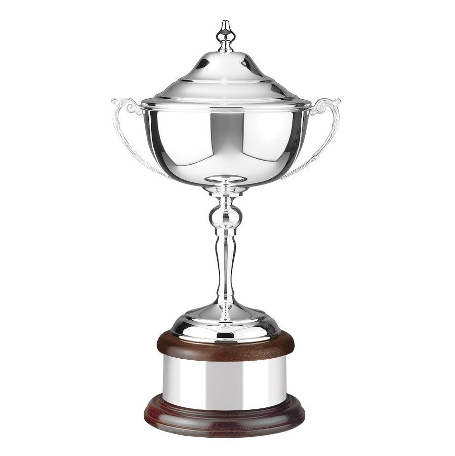With a matching 3D golfer and mounted on a sleek mahogany base complete with plinth band is this stunning silver plated Golf Challenge Cup trophy. This impressive award would take pride of place within any Golf club. Both band and body of these trophies can be engraved with text tailored to your requirements.