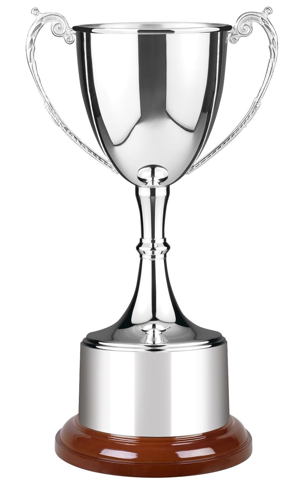 An elegant silver plated cup complete with integral silver plated plinth band sits this stunning trophy. Decorative handles gives this stunning award a unique finish. Large engraving area on the body can be inscribed with text and the plinth would give many years of winners names.